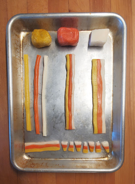 Divisez chaque boule colorée en trois ou quatre morceaux pairs, et en travaillant avec un morceau de chaque couleur, couvrez le reste de la pâte que vous n’utilisez pas avec un torchon humide. Rouler chaque morceau de pâte en une fine corde d’environ 1/4 « d’épaisseur.