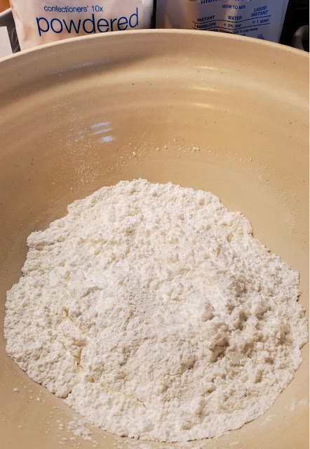 - Fouetter le sucre confiseur et le lait en poudre dans un bol moyen. Réserver.