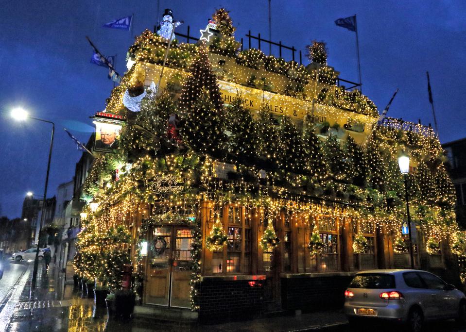 több mint 100 karácsonyfa és különböző díszek, köztük 25.000 fények szerte a Churchill … Fegyverek kocsma Kensingtonban, London. A Churchill Arms tett nevet magának, mint a londoni legünnepélyesebb pub köszönhetően az éves karácsonyi fények kijelző. A karácsonyi fenyőfákat a kocsma kerülete körül, az erkélyeken és a tetőn ültetik. Fotó: Keith Mayhew.