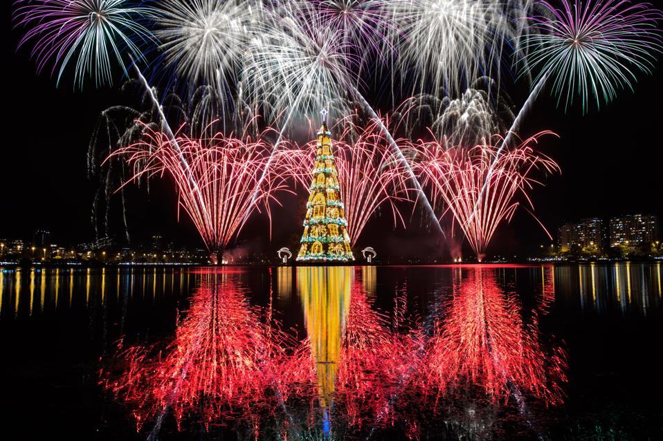 tűzijáték egy 85 méter magas úszó karácsonyfa felavatásakor Rodrigo de Freitasban … lagúna Rio de Janeiróban, Brazíliában. A Guinness Világrekordok által regisztrált világ legmagasabb úszó karácsonyfáját az év végéig minden este 3,1 millió fény világítja meg.