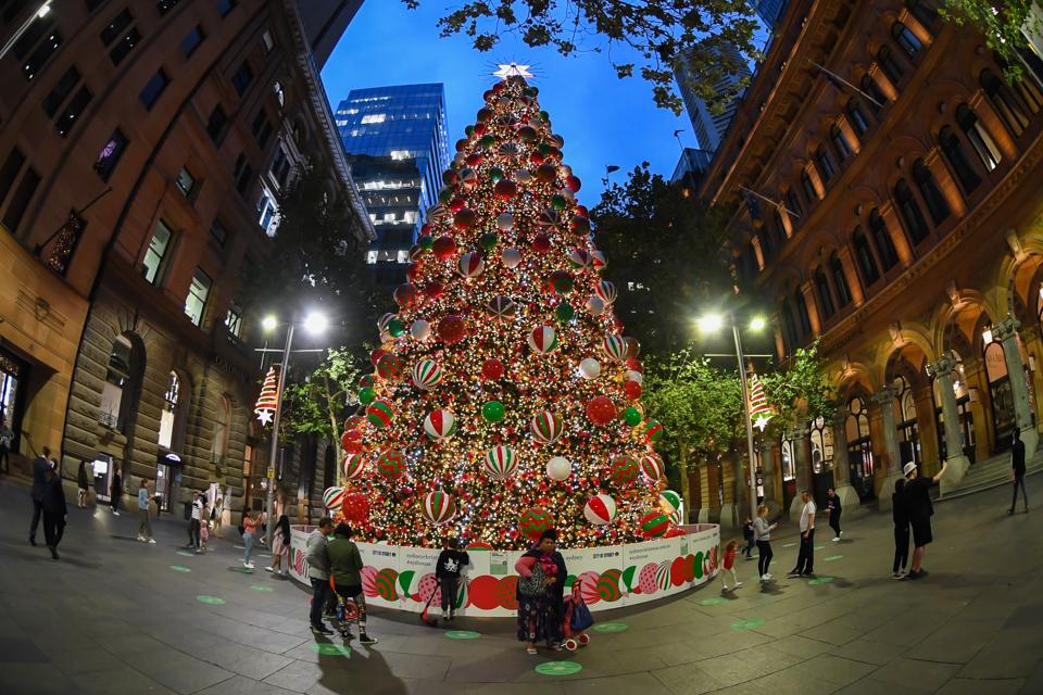karácsonyfa Martin Place Sydney-ben, Ausztrália. A legmagasabb karácsonyfa Új-Dél-Walesben … több mint 110 000 LED-es lámpával, egy 3,4 méteres színváltó csillaggal és 330 speciálisan létrehozott fényes díszléccel van díszítve. Fotó: James D. Morgan.