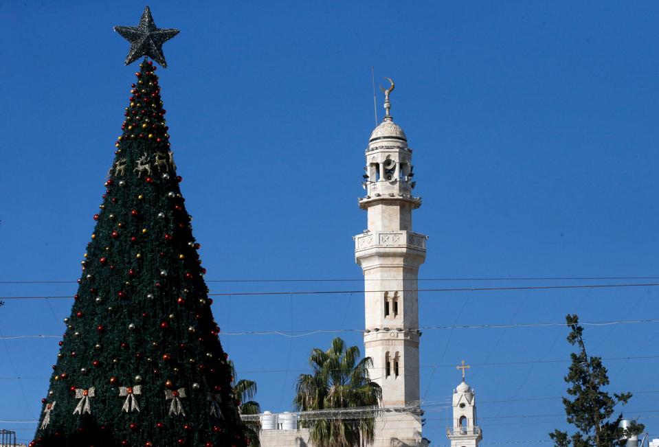 a hatalmas karácsonyfa egy mecset és egy templom közelében áll a megszállt Ciszjordániában. A betlehemi karácsonyi mise, amelyen általában keresztény gyülekezetek vesznek részt, ebben az évben a Covid-19 korlátozásai miatt zárva van a nyilvánosság előtt. A palesztin hatóságok új zárlatot vezettek be Ciszjordánia számos kormányzóságában, és esténként és hétvégén kijárási tilalmat hosszabbítottak meg az egész területen a koronavírus-fertőzések rohamának leküzdésére.