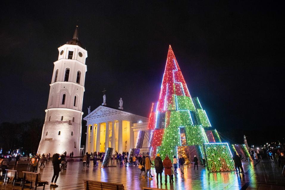 a Vilniusi karácsonyfa szürrealista képnek tűnik – egy modern, 24 méter magas kompozíció, amelyet 6000 élő és illatos ág vesz körül, majdnem négy kilométernyi színváltó karácsonyi fényekkel, 800 ezüst díszekkel és 150 négyzetméter ragyogó tükrökkel díszítve.