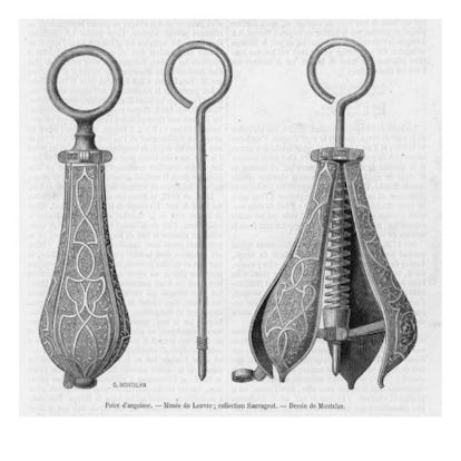 ClassenとScarboroughは、”苦悩の梨を食べる”は捕虜にされたり悲惨にされたりすることを意味するフランス語の諺であったと指摘している。 機械自体は、身体の一部(通常は膣または肛門)に挿入され、茎を回すことによって徐々に”開かれた”洋ナシ形の装置である。 それはその後、いくつかの薄く、鋭いスライバーにポップしました。 それは明らかに魔女、売春婦、同性愛者、そして拷問されている間に苦しみの外側の兆候を示さなかった人々のために予約されていました。 ある貧しい女性は、スペインの異端審問の間に、梨ahdは二十から六ターンを”開いた”、と、当然のことながら、すぐに死亡しました。